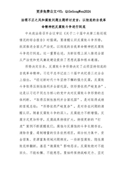 【七哥公文】2025年:治理不正之风和腐败问题主题研讨发言:以彻底的自我革命精神把反腐败斗争进行到底+更多免费公文+VX:QiGeGongWen2024+更多免费公文+VX:QiGeGongWen2024