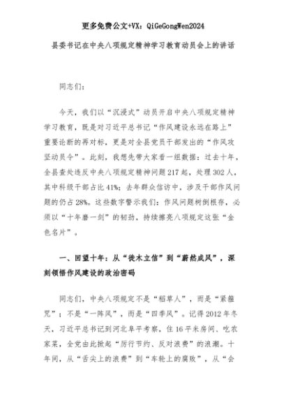 【七哥公文】2025年:县委书记在中央八项规定精神学习教育动员会上的讲话+更多免费公文+VX:QiGeGongWen2024+更多免费公文+VX:QiGeGongWen2024