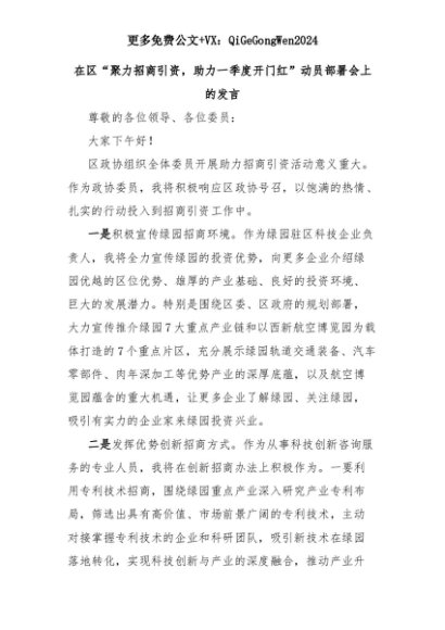 【七哥公文】2025年:在区“聚力招商引资,助力一季度开门红”动员部署会上的发言+更多免费公文+VX:QiGeGongWen2024+更多免费公文+VX:QiGeGongWen2024
