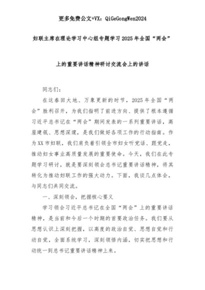 【七哥公文】2025年:妇联主席在理论学习中心组专题学习2025年全国“两会”上的重要讲话精神研讨交流会上的讲话+更多免费公文+VX:QiGeGongWen2024+更多免费公文+VX:QiGeGongWen2024