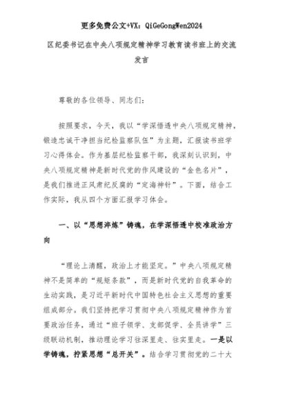 【七哥公文】2025年:区纪委书记在中央八项规定精神学习教育读书班上的交流发言+更多免费公文+VX:QiGeGongWen2024+更多免费公文+VX:QiGeGongWen2024