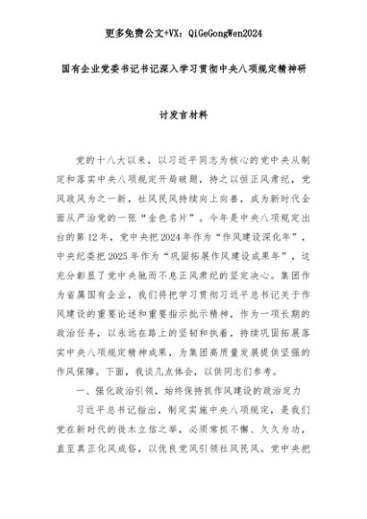 【七哥公文】2025年:国有企业党委书记书记深入学习贯彻中央八项规定精神研讨发言材料+更多免费公文+VX:QiGeGongWen2024+更多免费公文+VX:QiGeGongWen2024