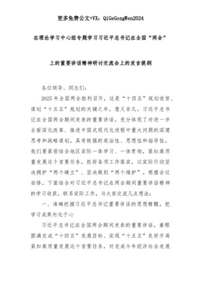 【七哥公文】2025年:在理论学习中心组专题学习习总书记在全国“两会”上的重要讲话精神研讨交流会上的发言提纲+更多免费公文+VX:QiGeGongWen2024+更多免费公文+VX:QiGeGongWen2024