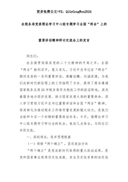 【七哥公文】2025年:在税务局党委理论学习中心组专题学习全国“两会”上的重要讲话精神研讨交流会上的发言+更多免费公文+VX:QiGeGongWen2024+更多免费公文+VX:QiGeGongWen2024