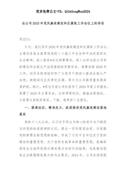 【七哥公文】2025年:在公司2025年党风廉政建设和反腐败工作会议上的讲话+更多免费公文+VX:QiGeGongWen2024+更多免费公文+VX:QiGeGongWen2024