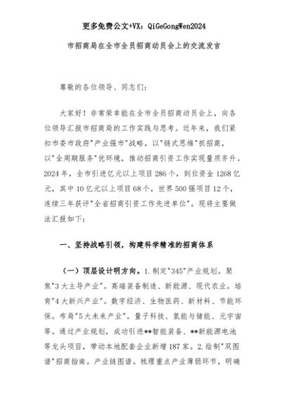 【七哥公文】2025年:市招商局在全市全员招商动员会上的交流发言+更多免费公文+VX:QiGeGongWen2024+更多免费公文+VX:QiGeGongWen2024