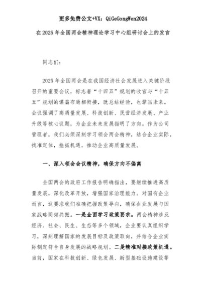 【七哥公文】2025年:在2025年全国两会精神理论学习中心组研讨会上的发言+更多免费公文+VX:QiGeGongWen2024+更多免费公文+VX:QiGeGongWen2024