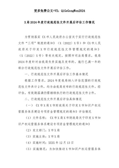 【七哥公文】2025年:X局2024年度行政规范性文件开展后评估工作情况+更多免费公文+VX:QiGeGongWen2024+更多免费公文+VX:QiGeGongWen2024