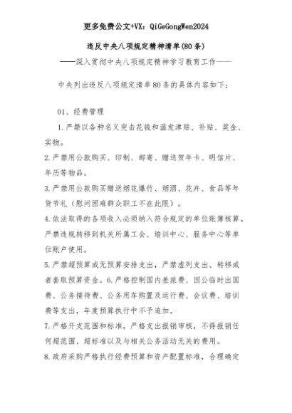 【七哥公文】2025年:(80条)违反中央八项规定精神清单+更多免费公文+VX:QiGeGongWen2024+更多免费公文+VX:QiGeGongWen2024