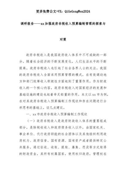 【七哥公文】2025年:调研报告——xx加强政府非税收入预算编制管理的探索与对策+更多免费公文+VX:QiGeGongWen2024+更多免费公文+VX:QiGeGongWen2024