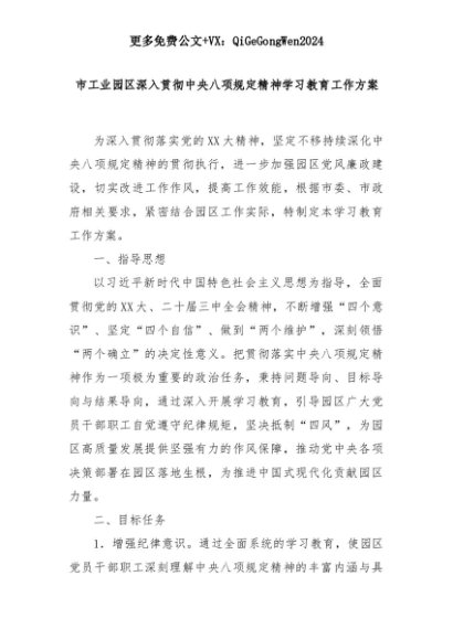【七哥公文】2025年:市工业园区深入贯彻中央八项规定精神学习教育工作方案+更多免费公文+VX:QiGeGongWen2024+更多免费公文+VX:QiGeGongWen2024