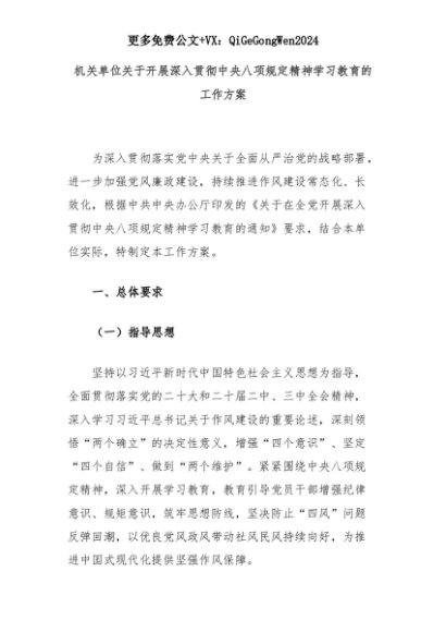 【七哥公文】2025年:机关单位关于开展深入贯彻中央八项规定精神学习教育的工作方案+更多免费公文+VX:QiGeGongWen2024+更多免费公文+VX:QiGeGongWen2024