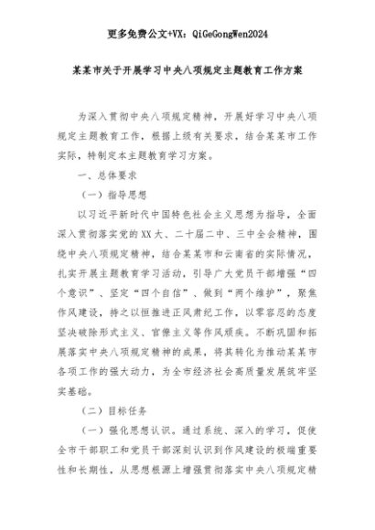 【七哥公文】2025年:某某市关于开展学习中央八项规定主题教育工作方案+更多免费公文+VX:QiGeGongWen2024+更多免费公文+VX:QiGeGongWen2024