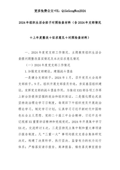 【七哥公文】2025年:2024年组织生活会班子对照检查材料(含2024年支部情况+上年度整改+征求意见+对照检查材料)+更多免费公文+VX:QiGeGongWen2024+更多免费公文+VX:QiGeGongWen2024