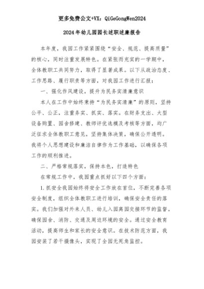 【七哥公文】2025年:2024年幼儿园园长述职述廉报告+更多免费公文+VX:QiGeGongWen2024+更多免费公文+VX:QiGeGongWen2024