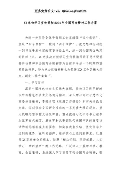 【七哥公文】2025年:XX单位学习宣传贯彻2024年全国两会精神工作方案+更多免费公文+VX:QiGeGongWen2024+更多免费公文+VX:QiGeGongWen2024