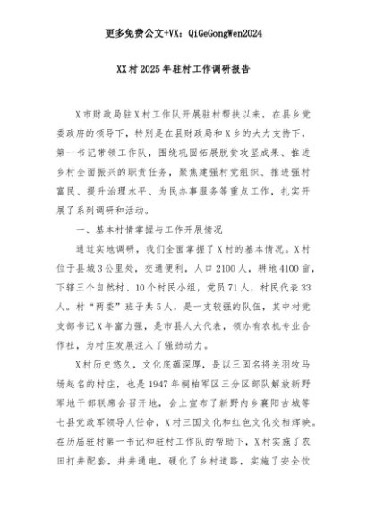 【七哥公文】2025年:XX村2025年驻村工作调研报告+更多免费公文+VX:QiGeGongWen2024+更多免费公文+VX:QiGeGongWen2024