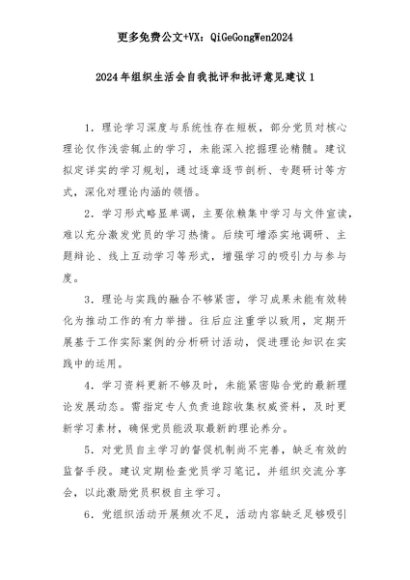 【七哥公文】2025年:2024年组织生活会自我批评和批评意见建议1+更多免费公文+VX:QiGeGongWen2024+更多免费公文+VX:QiGeGongWen2024