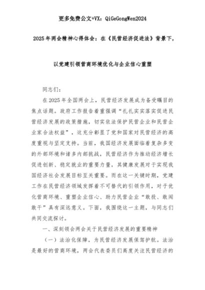 【七哥公文】2025年:2025年两会精神心得体会:在《民营经济促进法》背景下,以党建引领营商环境优化与企业信心重塑+更多免费公文+VX:QiGeGongWen2024+更多免费公文+VX:QiGeGongWen2024