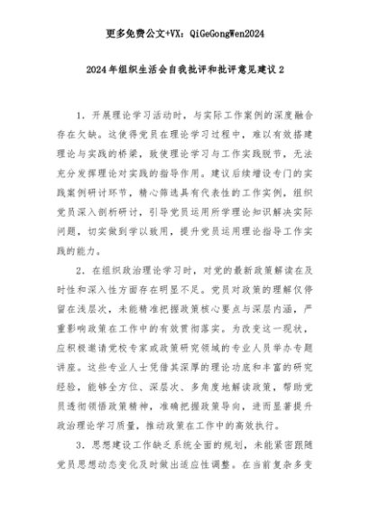 【七哥公文】2025年:2024年组织生活会自我批评和批评意见建议2+更多免费公文+VX:QiGeGongWen2024+更多免费公文+VX:QiGeGongWen2024