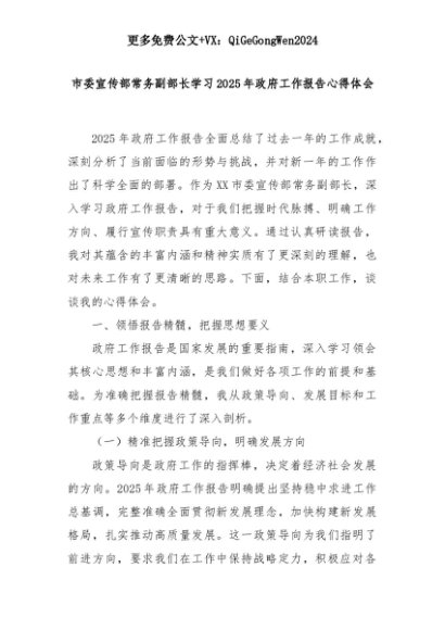 【七哥公文】2025年:市委宣传部常务副部长学习2025年政府工作报告心得体会+更多免费公文+VX:QiGeGongWen2024+更多免费公文+VX:QiGeGongWen2024