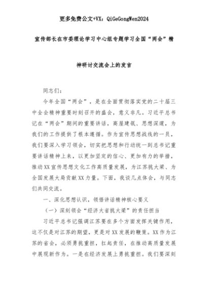 【七哥公文】2025年:宣传部长在市委理论学习中心组专题学习全国“两会”精神研讨交流会上的发言+更多免费公文+VX:QiGeGongWen2024+更多免费公文+VX:QiGeGongWen2024