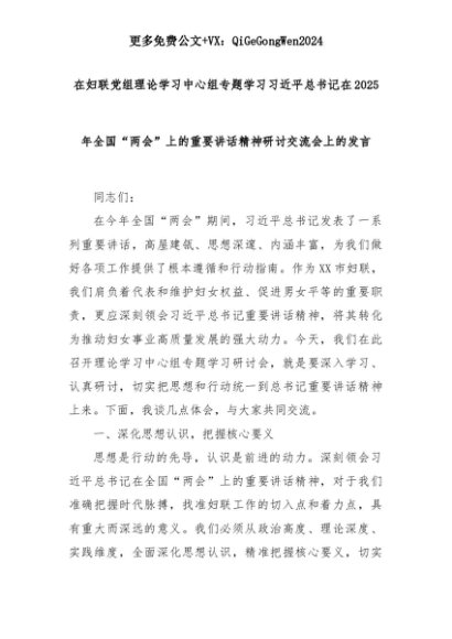 【七哥公文】2025年:在妇联党组理论学习中心组专题学习习近平总书记在2025年全国“两会”上的重要讲话精神研讨交流会上的发言+更多免费公文+VX:QiGeGongWen2024+更多免费公文+VX:QiGeGongWen2024