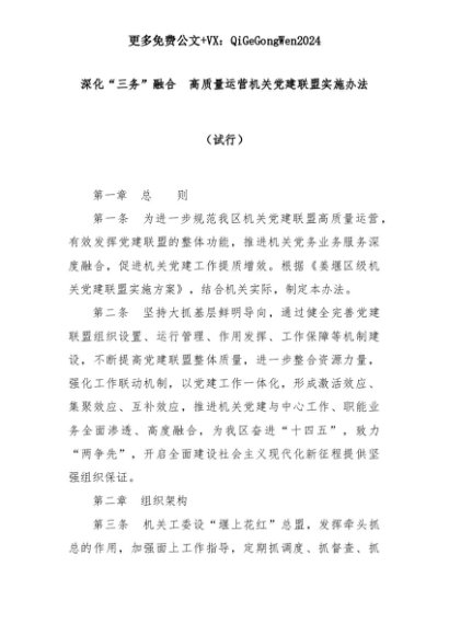 【七哥公文】2025年:深化“三务”融合 高质量运营机关党建联盟实施办法(试行)+更多免费公文+VX:QiGeGongWen2024+更多免费公文+VX:QiGeGongWen2024