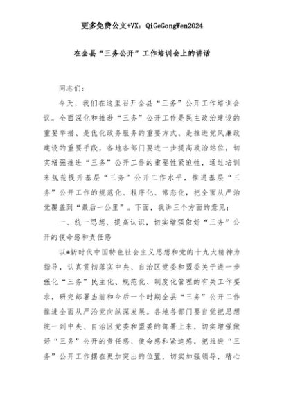 【七哥公文】2025年:在全县“三务公开”工作培训会上的讲话+更多免费公文+VX:QiGeGongWen2024+更多免费公文+VX:QiGeGongWen2024