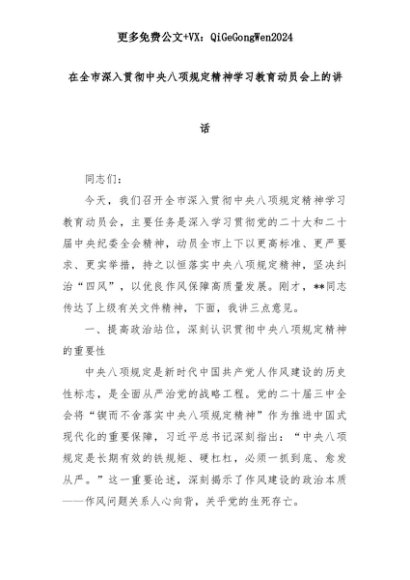 【七哥公文】2025年:在全市深入贯彻中央八项规定精神学习教育动员会上的讲话+更多免费公文+VX:QiGeGongWen2024+更多免费公文+VX:QiGeGongWen2024