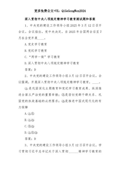 【七哥公文】2025年:深入贯彻中央八项规定精神学习教育测试题和答案+更多免费公文+VX:QiGeGongWen2024+更多免费公文+VX:QiGeGongWen2024
