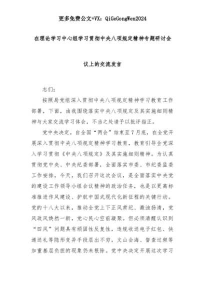 【七哥公文】2025年:在理论学习中心组学习贯彻中央八项规定精神专题研讨会议上的交流发言+更多免费公文+VX:QiGeGongWen2024+更多免费公文+VX:QiGeGongWen2024