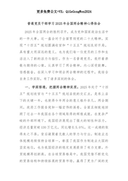 【七哥公文】2025年:普通党员干部学习2025年全国两会精神心得体会+更多免费公文+VX:QiGeGongWen2024+更多免费公文+VX:QiGeGongWen2024