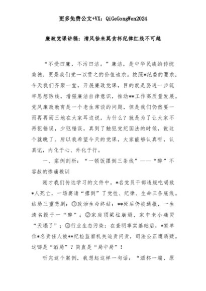 【七哥公文】2025年:廉政党课讲稿:清风徐来莫贪杯纪律红线不可越+更多免费公文+VX:QiGeGongWen2024+更多免费公文+VX:QiGeGongWen2024