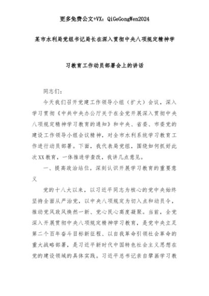 【七哥公文】2025年:某市水利局党组书记局长在深入贯彻中央八项规定精神学习教育工作动员部署会上的讲话+更多免费公文+VX:QiGeGongWen2024+更多免费公文+VX:QiGeGongWen2024
