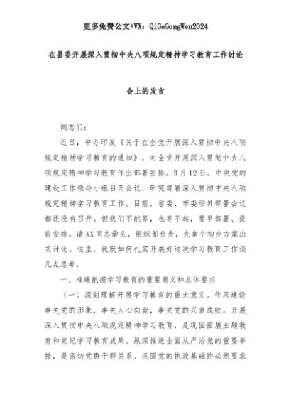 【七哥公文】2025年:在县委开展深入贯彻中央八项规定精神学习教育工作讨论会上的发言+更多免费公文+VX:QiGeGongWen2024+更多免费公文+VX:QiGeGongWen2024