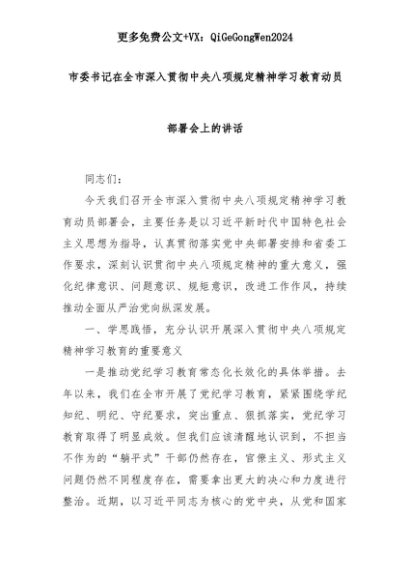 【七哥公文】2025年:市委书记在全市深入贯彻中央八项规定精神学习教育动员部署会上的讲话+更多免费公文+VX:QiGeGongWen2024+更多免费公文+VX:QiGeGongWen2024