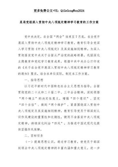 【七哥公文】2025年:某局党组深入贯彻中央八项规定精神学习教育的工作方案+更多免费公文+VX:QiGeGongWen2024+更多免费公文+VX:QiGeGongWen2024
