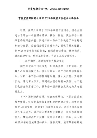 【七哥公文】2025年:市委宣传部副部长学习2025年政府工作报告心得体会+更多免费公文+VX:QiGeGongWen2024+更多免费公文+VX:QiGeGongWen2024