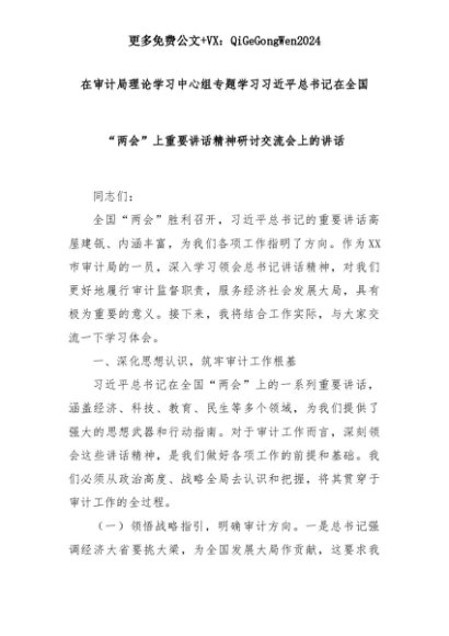 【七哥公文】2025年:在审计局理论学习中心组专题学习习总书记在全国“两会”上重要讲话精神研讨交流会上的讲话+更多免费公文+VX:QiGeGongWen2024+更多免费公文+VX:QiGeGongWen2024