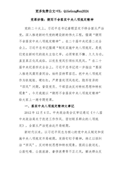 【七哥公文】2025年:党课讲稿:锲而不舍落实中央八项规定精神+更多免费公文+VX:QiGeGongWen2024+更多免费公文+VX:QiGeGongWen2024