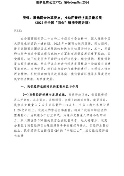 【七哥公文】2025年:党课:聚焦两会改革要点,推动民营经济高质量发展(2025年全国“两会”精神专题讲稿)+更多免费公文+VX:QiGeGongWen2024+更多免费公文+VX:QiGeGongWen2024