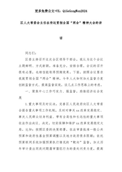 【七哥公文】2025年:区人大常委会主任在传达贯彻全国“两会”精神大会的讲话+更多免费公文+VX:QiGeGongWen2024+更多免费公文+VX:QiGeGongWen2024