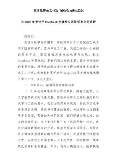 【七哥公文】2025年:在2025年审计厅DeepSeek大模型应用培训会上的讲话+更多免费公文+VX:QiGeGongWen2024+更多免费公文+VX:QiGeGongWen2024