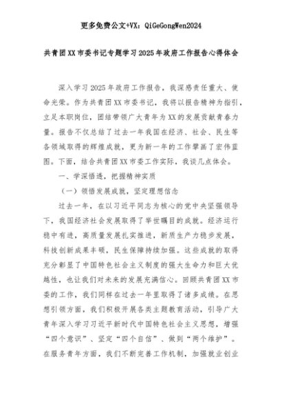 【七哥公文】2025年:共青团XX市委书记专题学习2025年政府工作报告心得体会+更多免费公文+VX:QiGeGongWen2024+更多免费公文+VX:QiGeGongWen2024