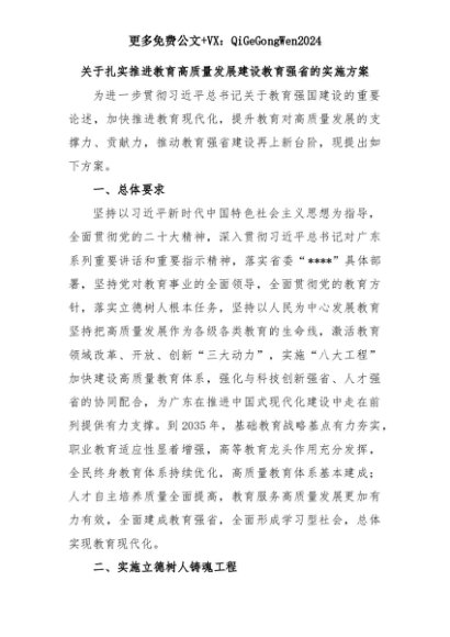 【七哥公文】2025年:关于扎实推进教育高质量发展建设教育强省的实施方案+更多免费公文+VX:QiGeGongWen2024+更多免费公文+VX:QiGeGongWen2024