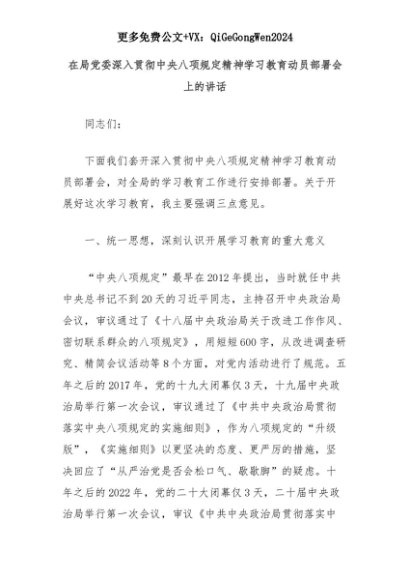 【七哥公文】2025年:在局党委深入贯彻中央八项规定精神学习教育动员部署会上的讲话+更多免费公文+VX:QiGeGongWen2024+更多免费公文+VX:QiGeGongWen2024