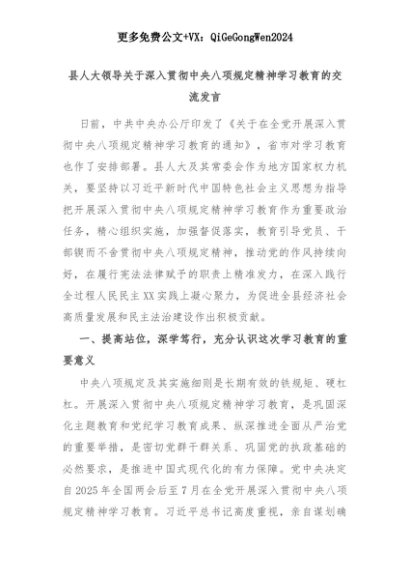 【七哥公文】2025年:县人大领导关于深入贯彻中央八项规定精神学习教育的交流发言+更多免费公文+VX:QiGeGongWen2024+更多免费公文+VX:QiGeGongWen2024