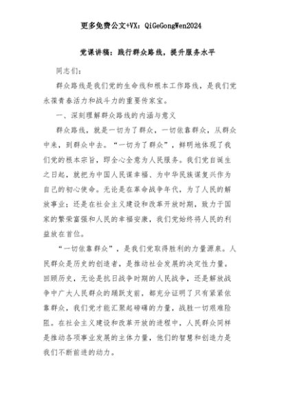 【七哥公文】2025年:党课讲稿:践行群众路线,提升服务水平+更多免费公文+VX:QiGeGongWen2024+更多免费公文+VX:QiGeGongWen2024