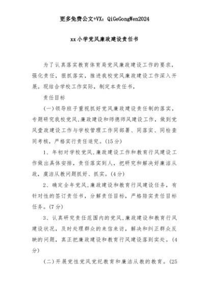 【七哥公文】2025年:xx小学党风廉政建设责任书+更多免费公文+VX:QiGeGongWen2024+更多免费公文+VX:QiGeGongWen2024